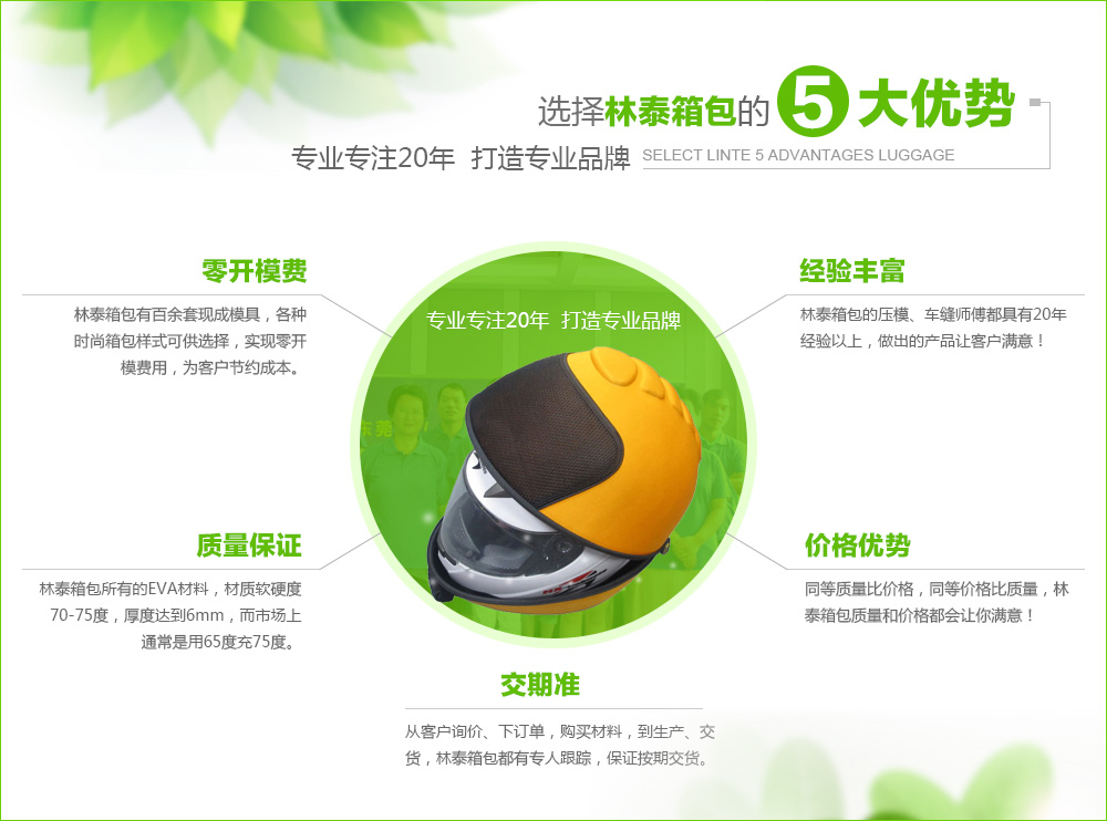 專注、專心、專業,是我們一直以來秉承的發展方針,林泰箱致力于發展箱包皮具,公司主營箱包皮具,在這一行有14年的生產經驗,地理位置也好,在交通發達的珠三角,公司可直接出口,有多年的外貿經驗。以及一批資深外貿人員。